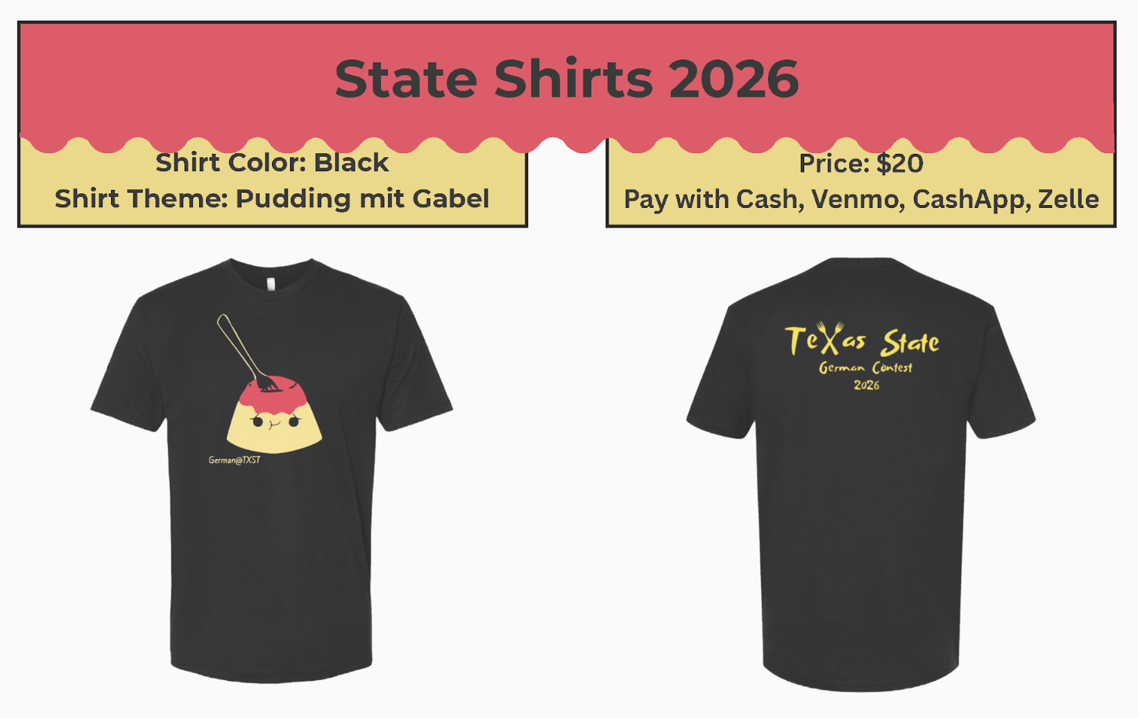 This is the official 2026 State T-Shirt sold by TX State University German Honor Society
